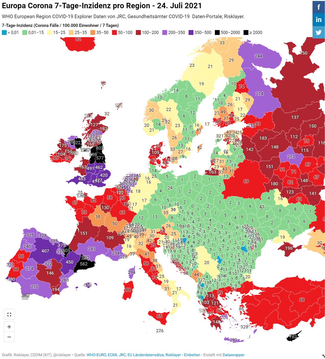 Risklayer On Twitter Corona 7 Tages Inzidenz In Europa Pro Region 14 Juli 2021 Corona Zahlen Explodieren Fast Uberall Weiter Inkl Deutschland Niederlande Viel Schwarz Jetzt Frankreich Tschechien Danemark Wieder Interaktiv Https
